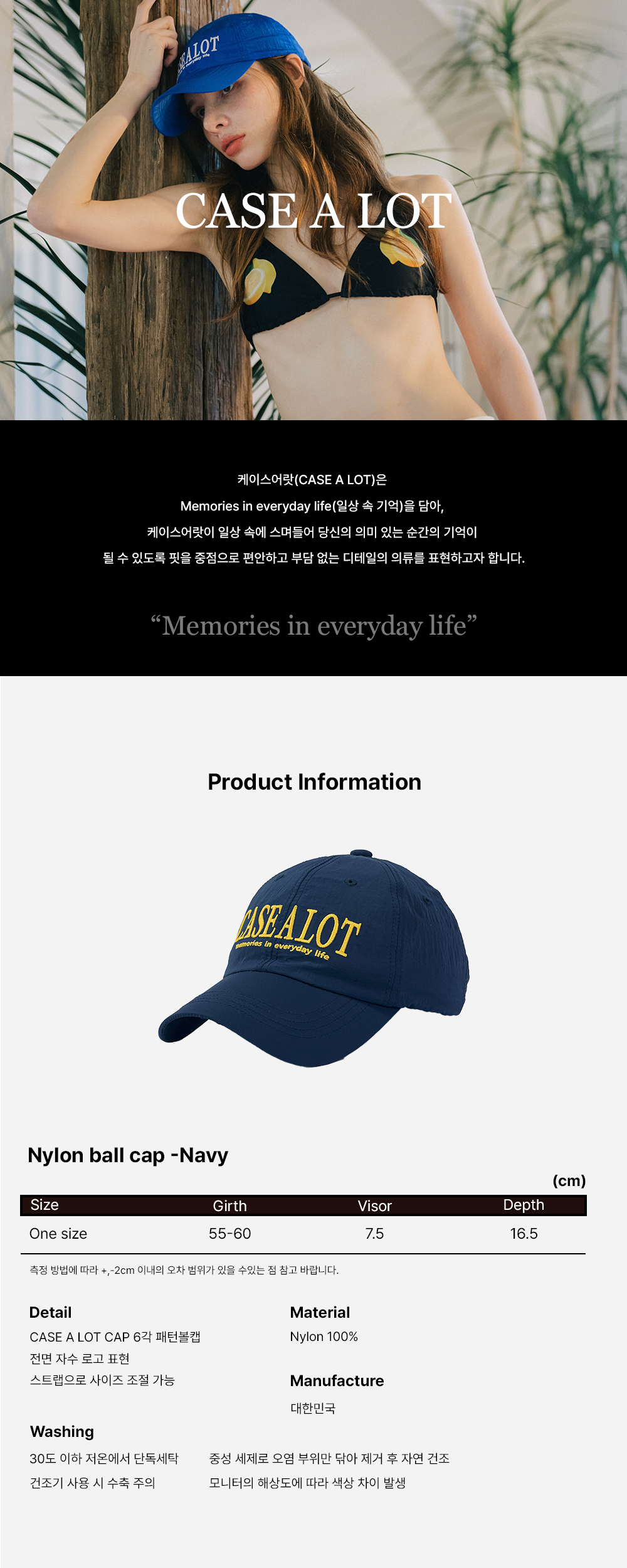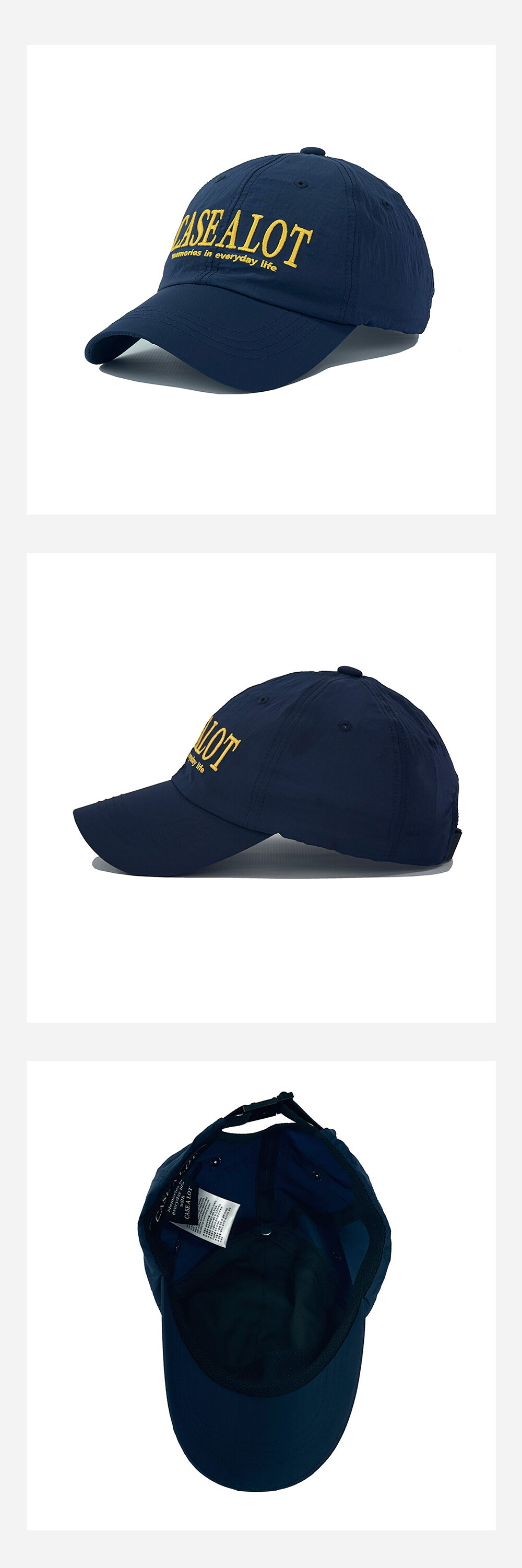 CASE A LOT만의 유니크한 색감과 고급스러운 디자인으로 제작된 나일론 볼캡입니다. 모자의 깊이감이 깊고 챙을 더 길게 제작하여 얼굴이 보다 작아보이며, 나일론 원단을 사용하여 땀 흡수와 통풍이 잘되어 답답하지 않는 케이스어랏의 일곱번째 볼캡 입니다.