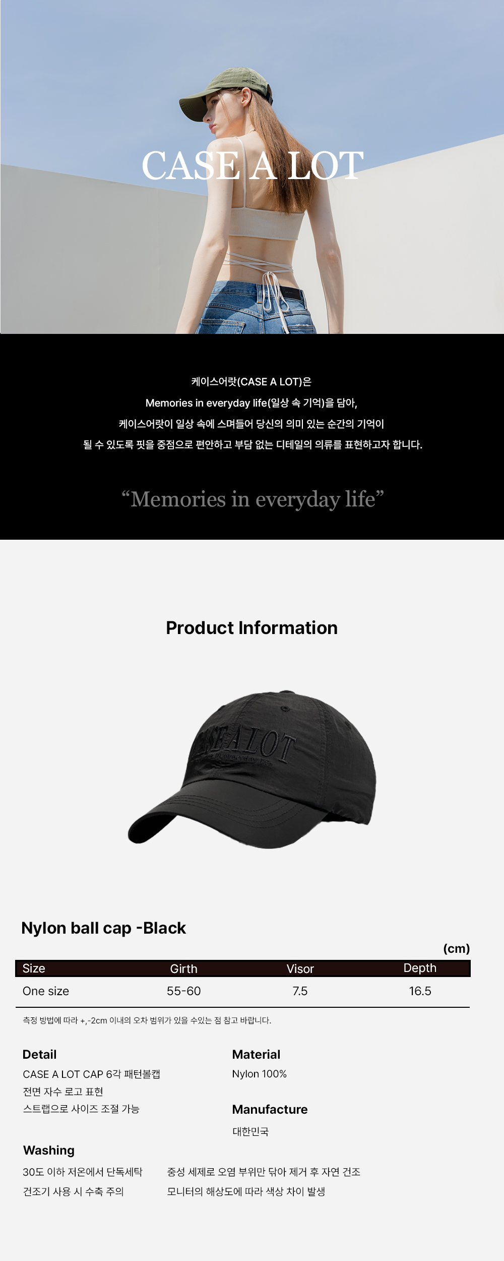 CASE A LOT만의 유니크한 색감과 고급스러운 디자인으로 제작된 나일론 볼캡입니다. 모자의 깊이감이 깊고 챙을 더 길게 제작하여 얼굴이 보다 작아보이며, 나일론 원단을 사용하여 땀 흡수와 통풍이 잘되어 답답하지 않는 케이스어랏의 일곱번째 볼캡 입니다.