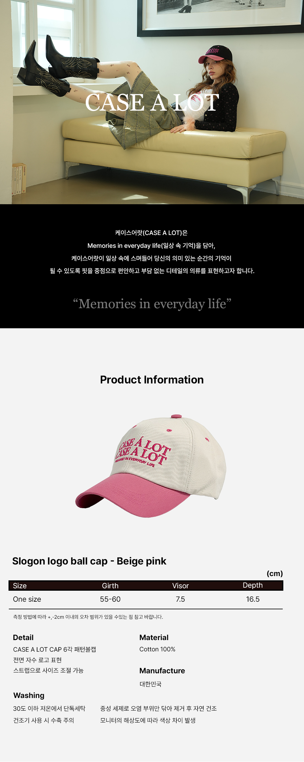 CASE A LOT만의 유니크 하면서도 고급스러운 디자인으로 제작된 슬로건 로고 볼캡입니다. 모자의 깊이감이 깊고 챙을 더 길게 제작하여 얼굴이 보다 작아보이며, 밀도 높은 원단을 사용하여 땀 흡수와 통풍이 잘되어 답답하지 않는 케이스어랏의 볼캡 입니다.