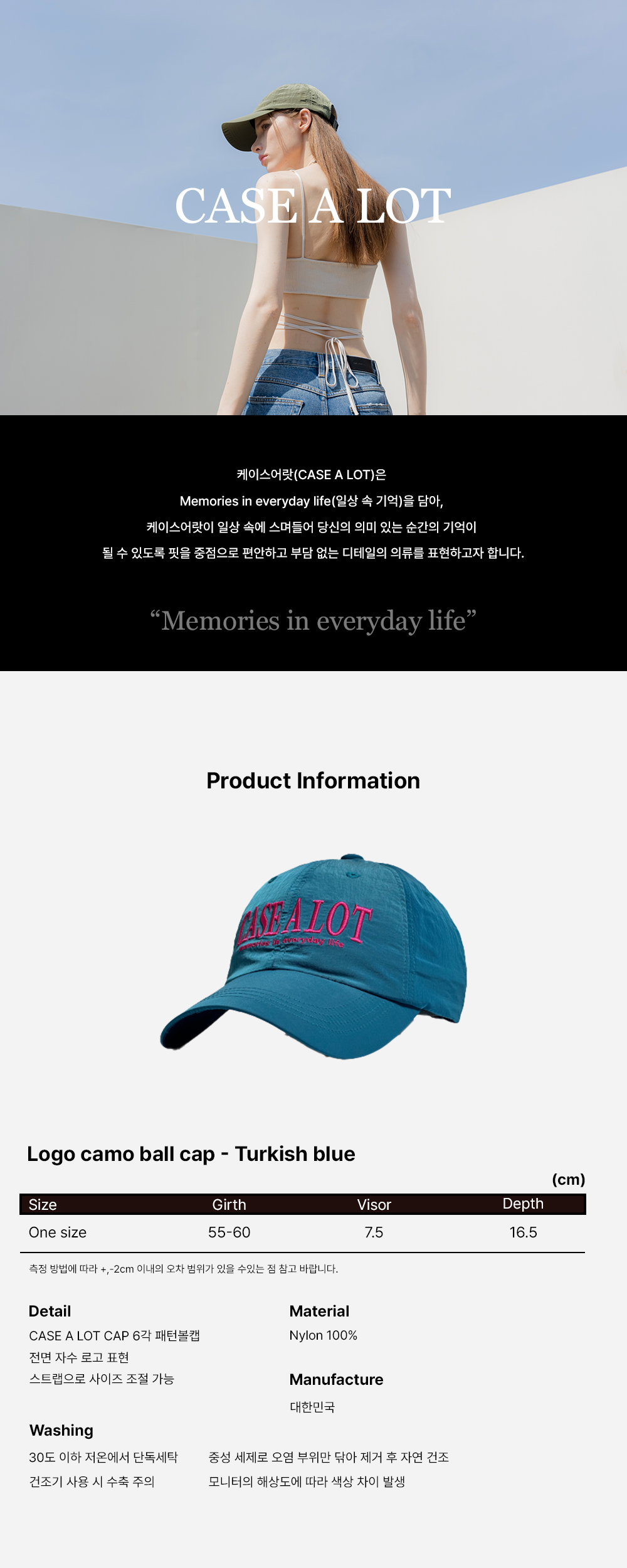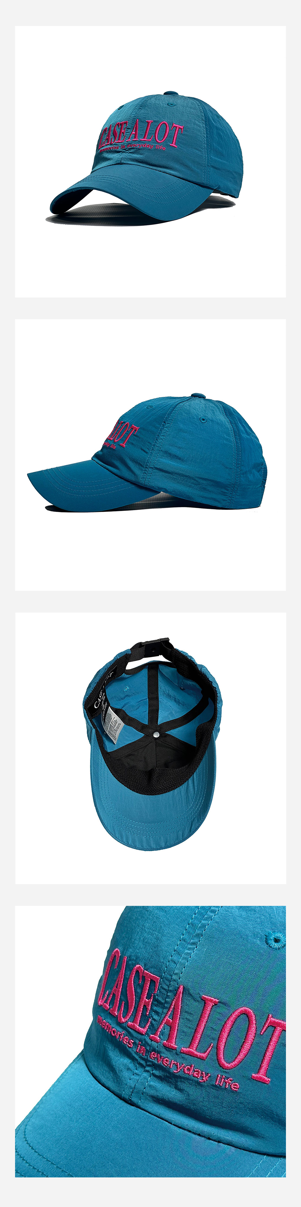 CASE A LOT만의 유니크한 색감과 고급스러운 디자인으로 제작된 나일론 볼캡입니다. 모자의 깊이감이 깊고 챙을 더 길게 제작하여 얼굴이 보다 작아보이며, 나일론 원단을 사용하여 땀 흡수와 통풍이 잘되어 답답하지 않는 케이스어랏의 일곱번째 볼캡 입니다.